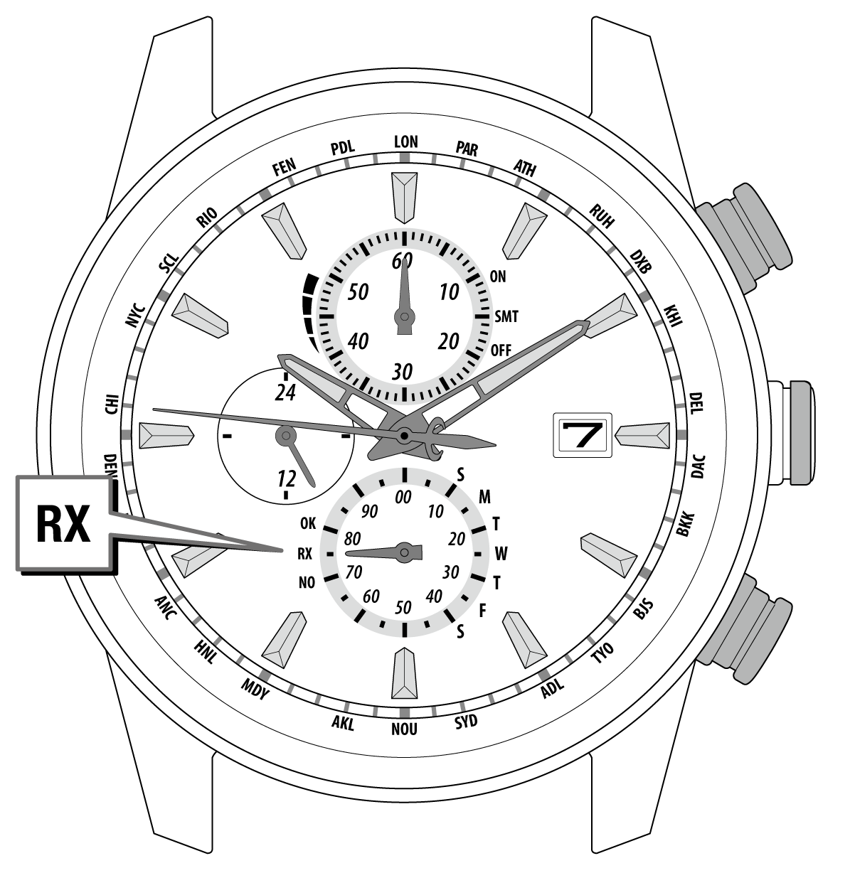 1/20クロノグラフ秒針が「RX」を指している間に、右下のAボタンを2秒間以上押し続けると、受信が中断され、通常表示に戻ります。