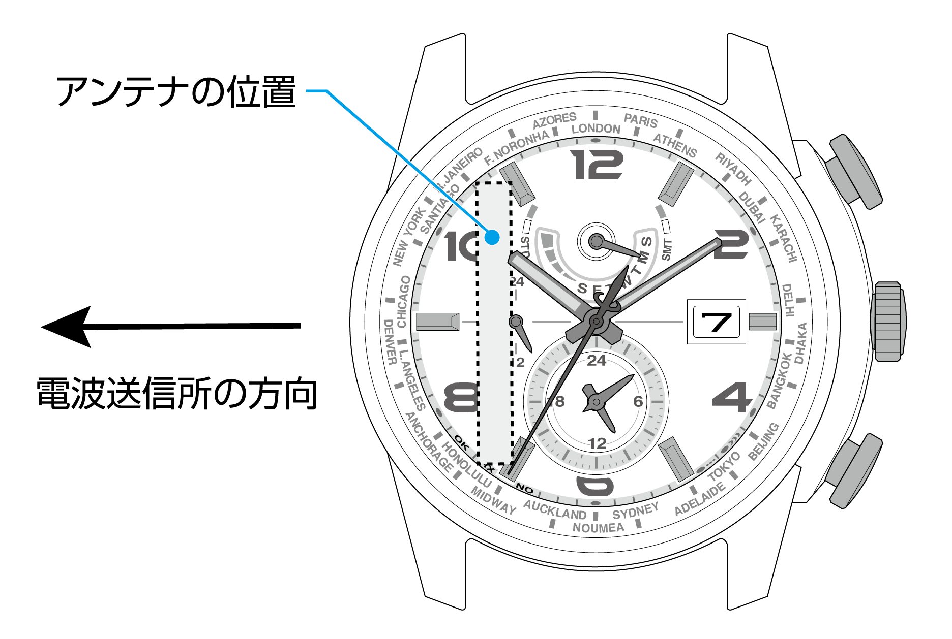 - 電波受信用のアンテナは、この時計の9時位置に組み込まれています。