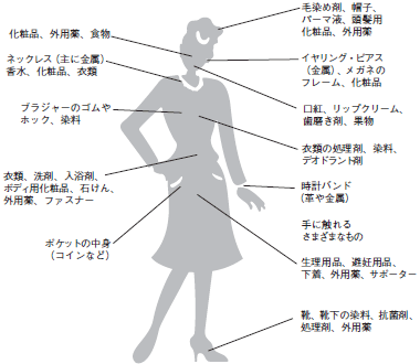 身に着けるものから起きる金属アレルギー(接触皮膚炎の発症部位と主な原因)