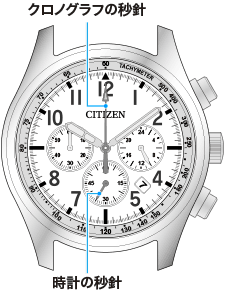 普通の時計では秒針の位置にあるクロノグラフ針は、細かく刻まれた目盛りの可読性を上げるため、細く、長くデザインされています。