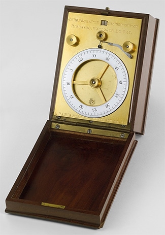 「クロノメーター」はもともと18世紀に、海洋上での精密な経度の測定を可能にするため開発された高精度の時計を指す言葉でした。最初は艦船に搭載可能な置き時計でしたので、ストップウオッチの機能とは本来無縁なものです。