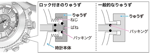 このロック機構は、りゅうずを「ねじ」のように時計側面に固定することから、「ねじロック」と呼ばれています。