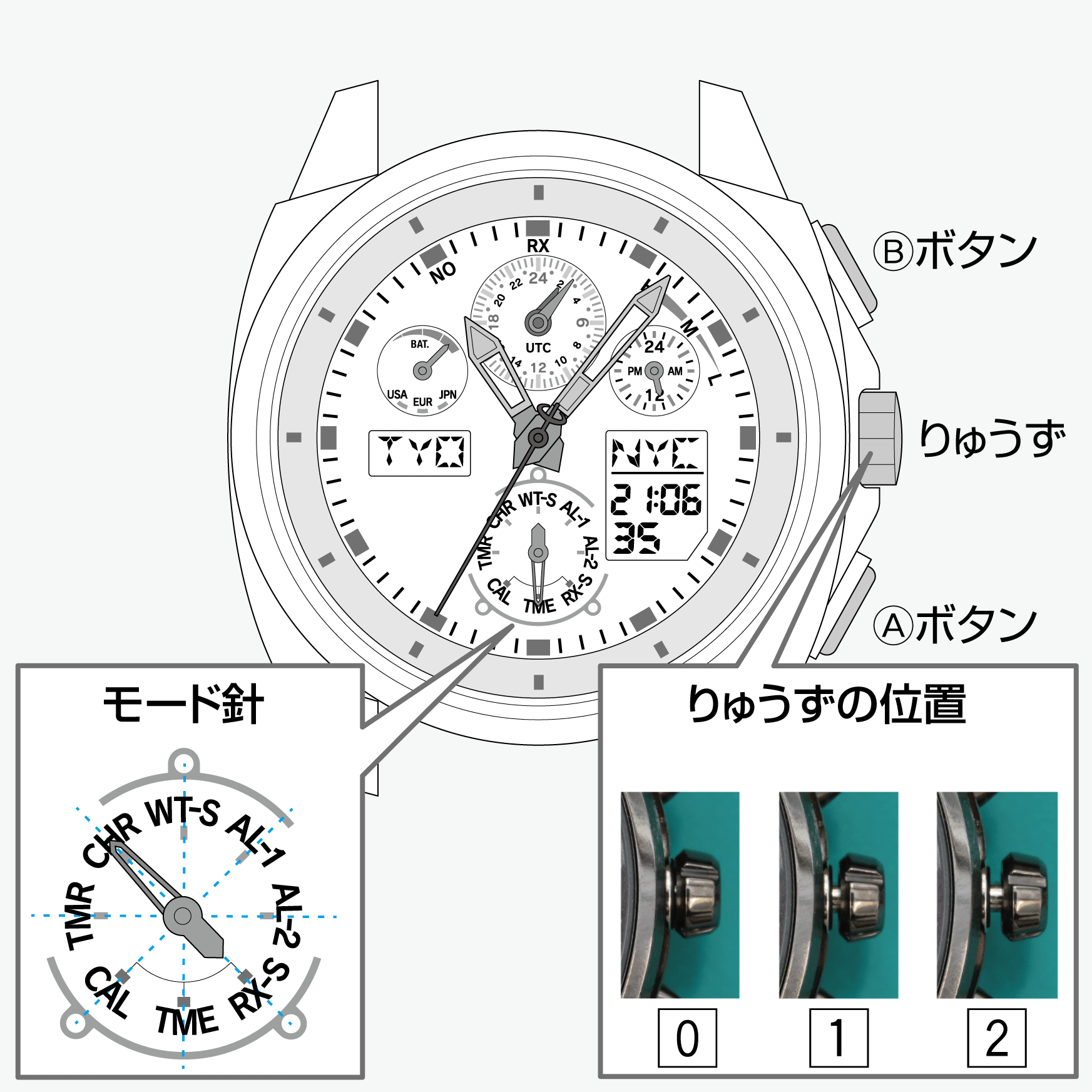 - りゅうずを回して、モード針を[TME]または[CAL]に合わせる