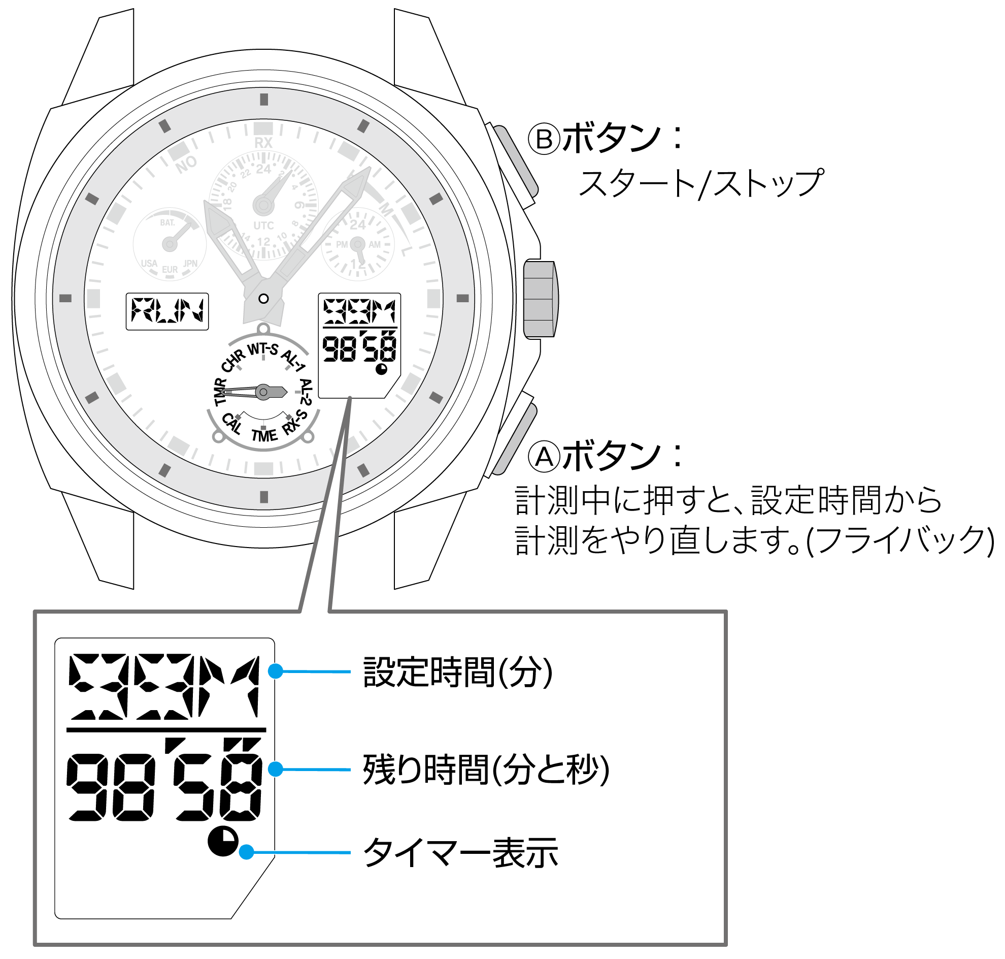 - りゅうずを回して、モード針を[TMR]に合わせる