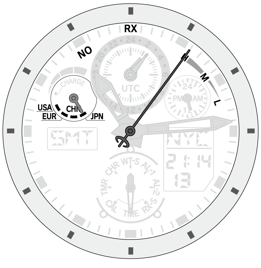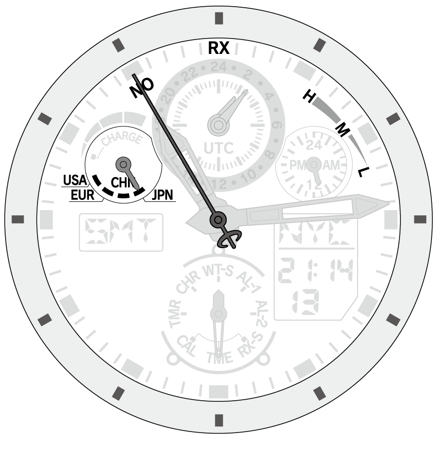 秒針が前回の受信結果を指し、充電量表示針が受信局を指します。