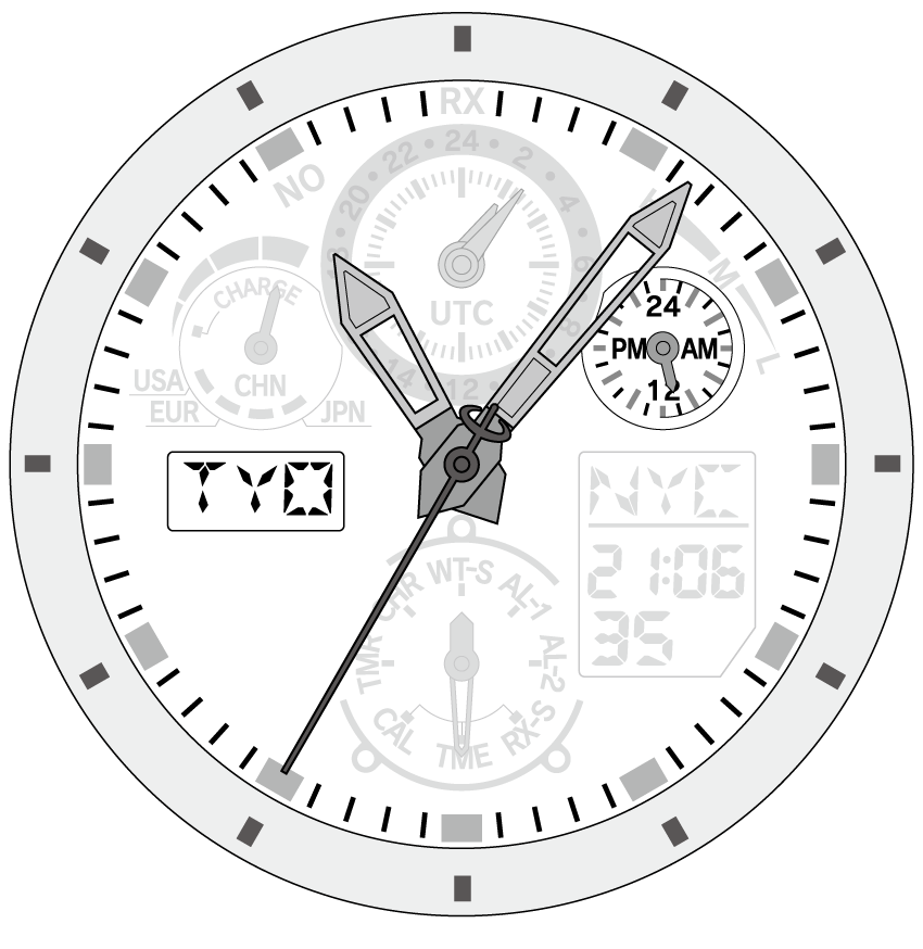 ワールドタイムの時差の設定は、りゅうずの位置が0のとき、デジタル表示に表示されています。