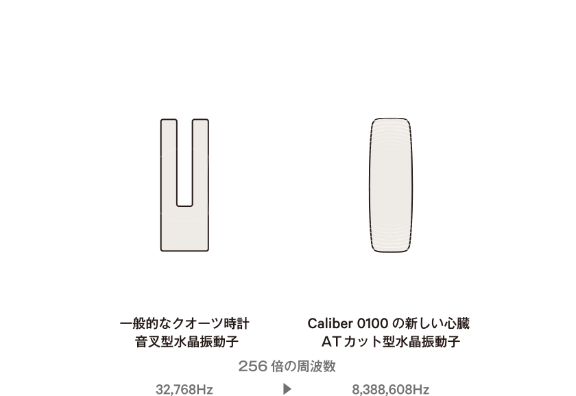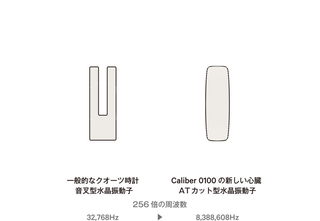 私たちは、常識とされていたクオーツ時計の心臓である音叉型水晶振動子に代わり、新しくATカット型水晶振動子を採用。