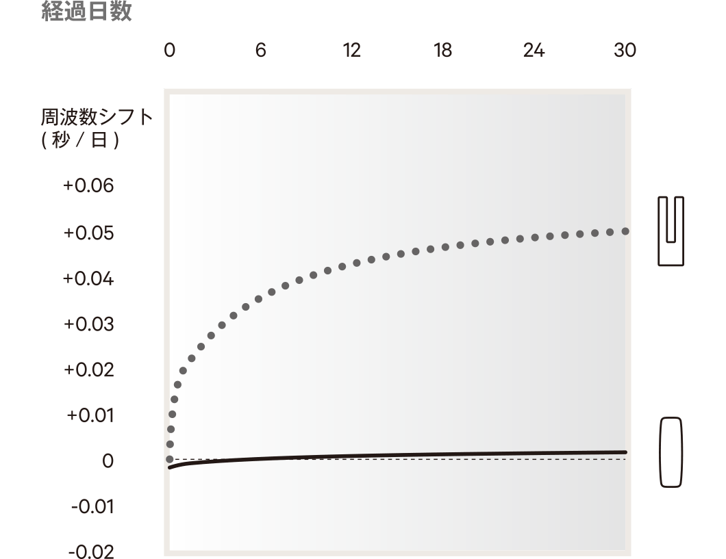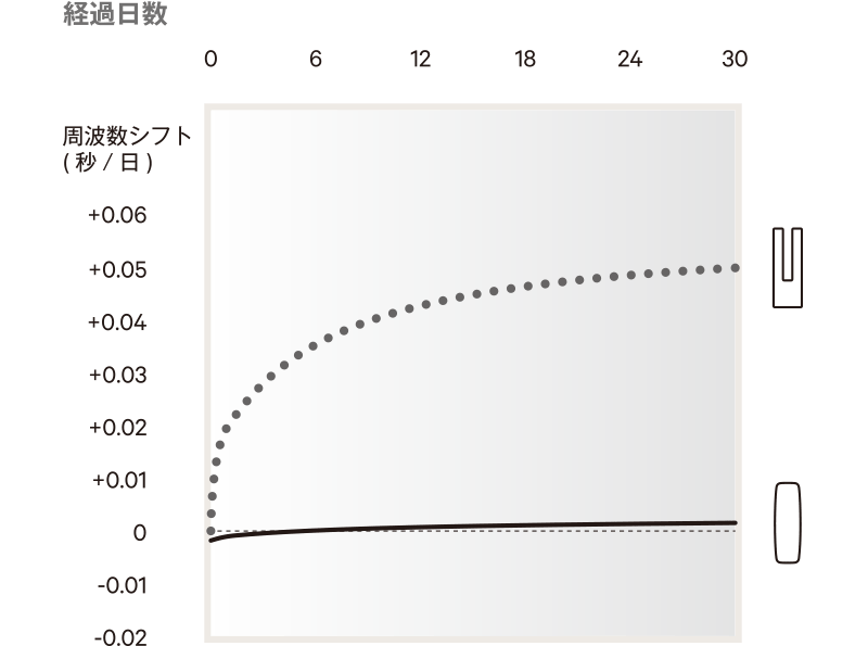 さらに、ATカット型水晶振動子は、完成直後の初期段階でエイジングによる周波数の変化が、音叉型水晶振動子に比べて小さいという優位点があります。シチズンでは、このATカット型水晶振動子にをエイジングを重ねて安定させるとともに、その過程で周波数の計測を行い、経時変化の少ないものだけを厳選。安定性に優れたATカット型水晶振動子だけを使用しています。