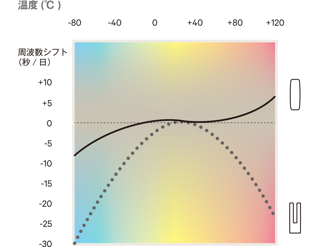 水晶振動子は、六角柱の水晶の原石から切り出してつくります。その際、切り出し角度によって温度特性と呼ばれる温度に対しての周波数変化量が異なることがわかっています。ATカット型水晶振動子は、右図のように常温付近の温度安定性が非常に優れているため、寒暖差の影響を最小限に抑えることが可能。季節が変わっても、朝夕で気温が変化しても、正確なリズムを崩しません。