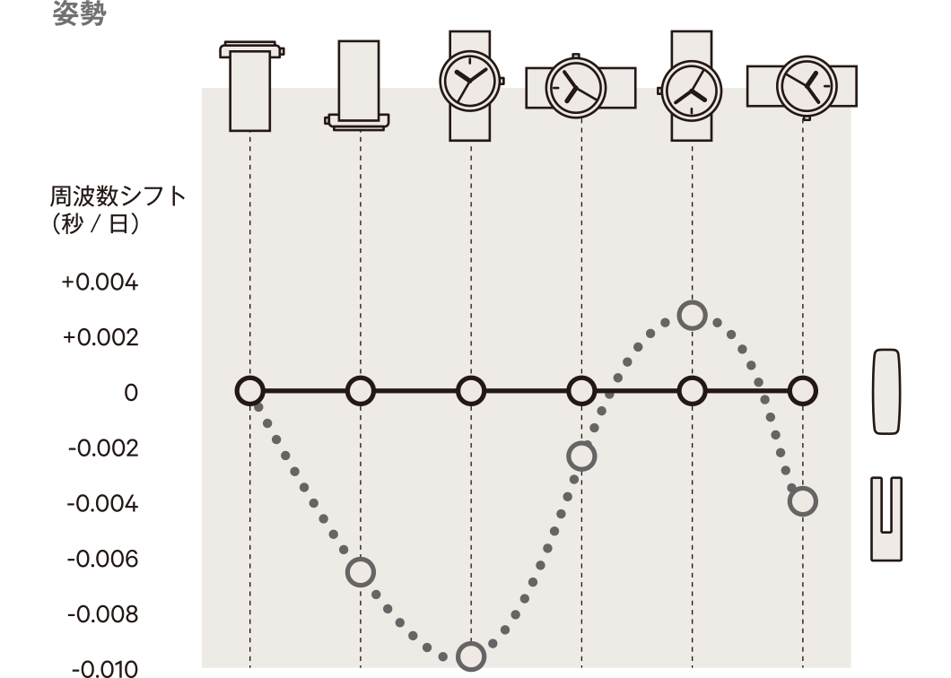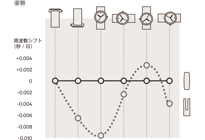 腕時計は置き時計と違い、腕の向きによってさまざまな姿勢になったり、腕振りで加速度が変化したりします。重力は水晶振動子にも影響を与えます。従来の音叉型水晶振動子は、中空で振動する“脚”を持つために、時計の向きを変えるだけでもわずかな誤差が生じていました。これに対してATカット型水晶振動子は、“脚”がなく安定性が高いために姿勢差の影響を極限まで低減。腕時計をどんな向きにしても、確かな1秒を刻み続けることができます。