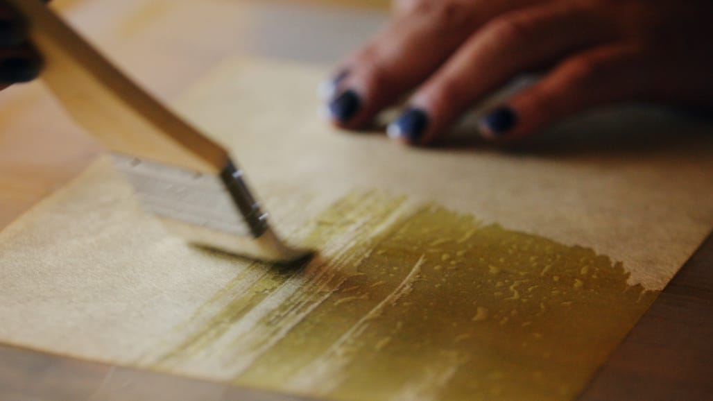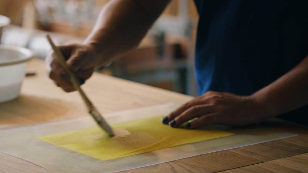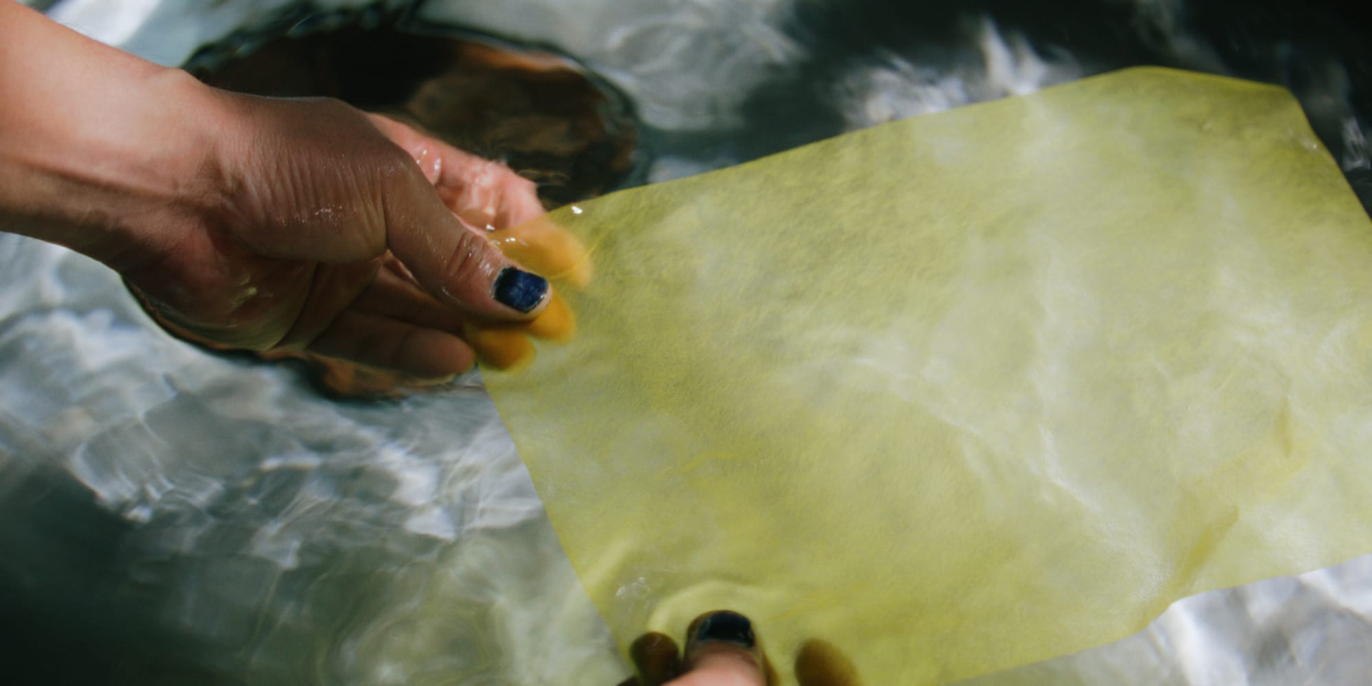 渡邊:草木染は布しか扱ってこなかったので、正直なところ、最初はやり方もわからない状態でした。土佐和紙はとても薄く、布とは性質もまったく違います。草木染では、煮出した染料に浸して染めるのが一般的ですが、それを和紙でどう行うのか。まずは、そこから考えなければならず……工房内で相談しながら、「こういう方法があるんじゃないか」と一つひとつ試し、草木染で黄色のベースをつくるところから始めました。