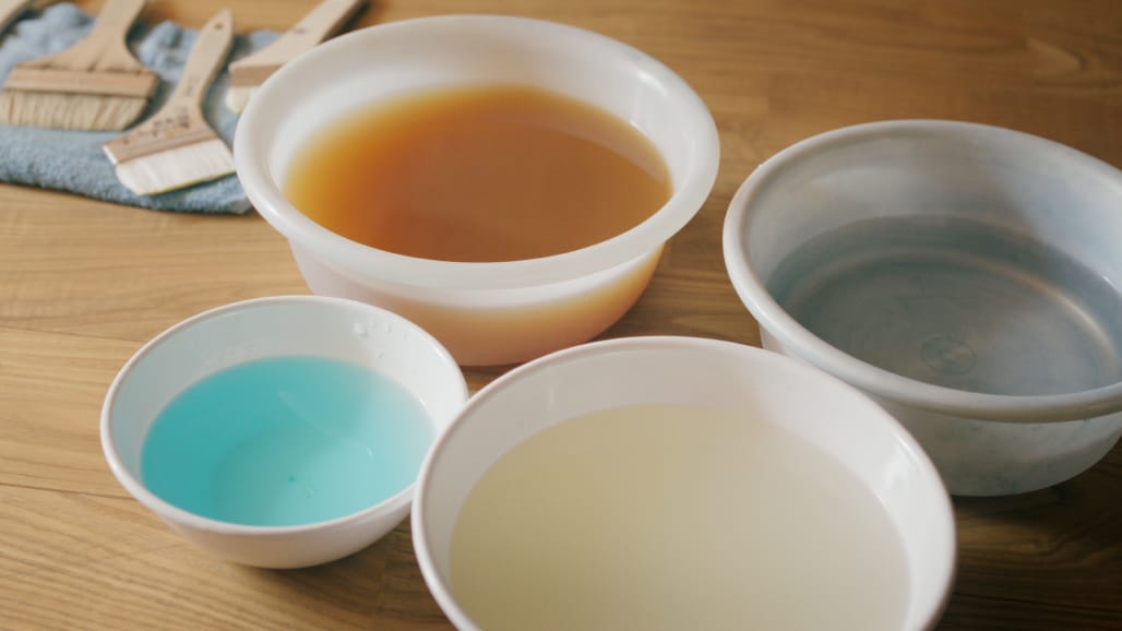 渡邊:まず、土佐和紙に呉汁(ごじる:大豆の絞り汁)を塗ることで、和紙の繊維に染料が定着しやすい状態をつくります。次に、乾燥させた後、煮出した伊吹刈安の染色液を刷毛で塗り、再び乾かします。この工程は、伊吹刈安の濃度を見ながら何度も繰り返します。その後、銅の媒染剤を使って、色を発色させ、一度洗って乾かします。乾燥が終わると、藍の染色に備えてこんにゃく糊を塗り、和紙の強度を高め、最後に何度も藍を重ねて染めていきます。藍染は浸けて引き上げれば色が定着しますが、草木染の場合は媒染や何度も塗布を繰り返す必要があり、普段あまり行わない工程も多いため、正直とても大変でした。