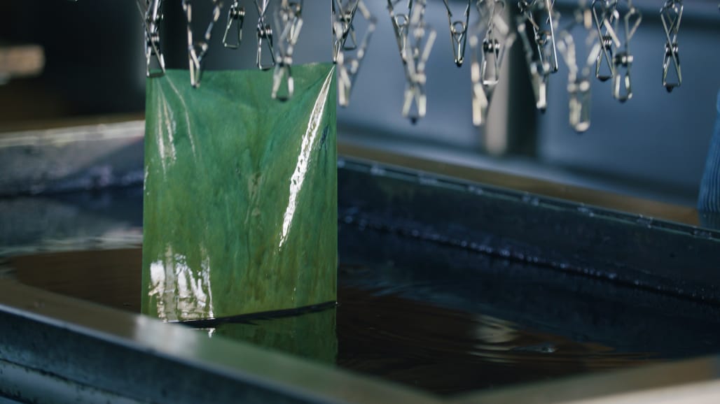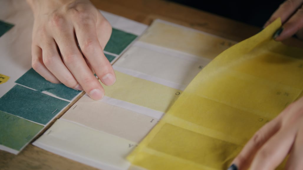 山影:調べていくと、自然界にある単一の材料から、緑色の染料を抽出するのは非常に困難であることが分かりました。けれども、日本では古くから、藍の青と、植物が持つ黄色を重ねることで、緑色を表現してきた歴史があることも同時に知りまして、これはThe CITIZENの思想に合うだろうなと。藍染和紙文字板の開発を経験していたので藍はすぐにイメージできましたが、化学染料を使うことなく、黄色をどう生み出すかは改めて考える必要がありました。