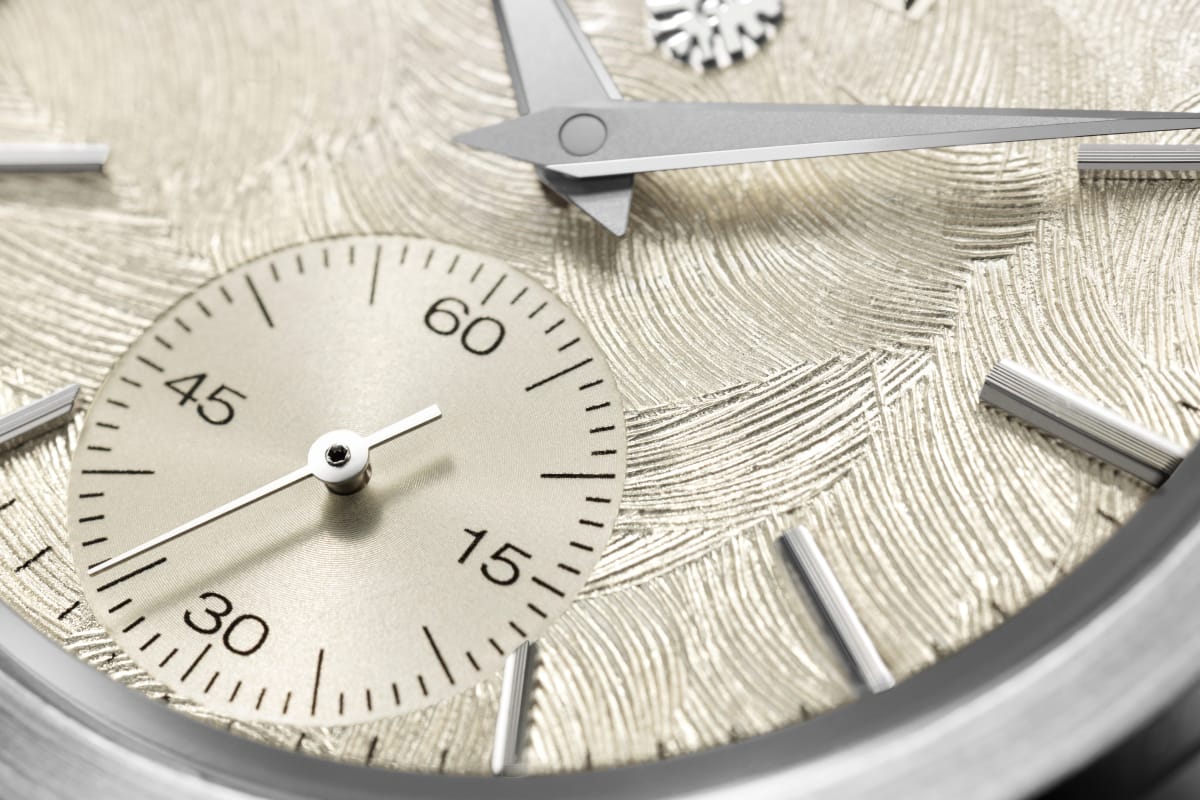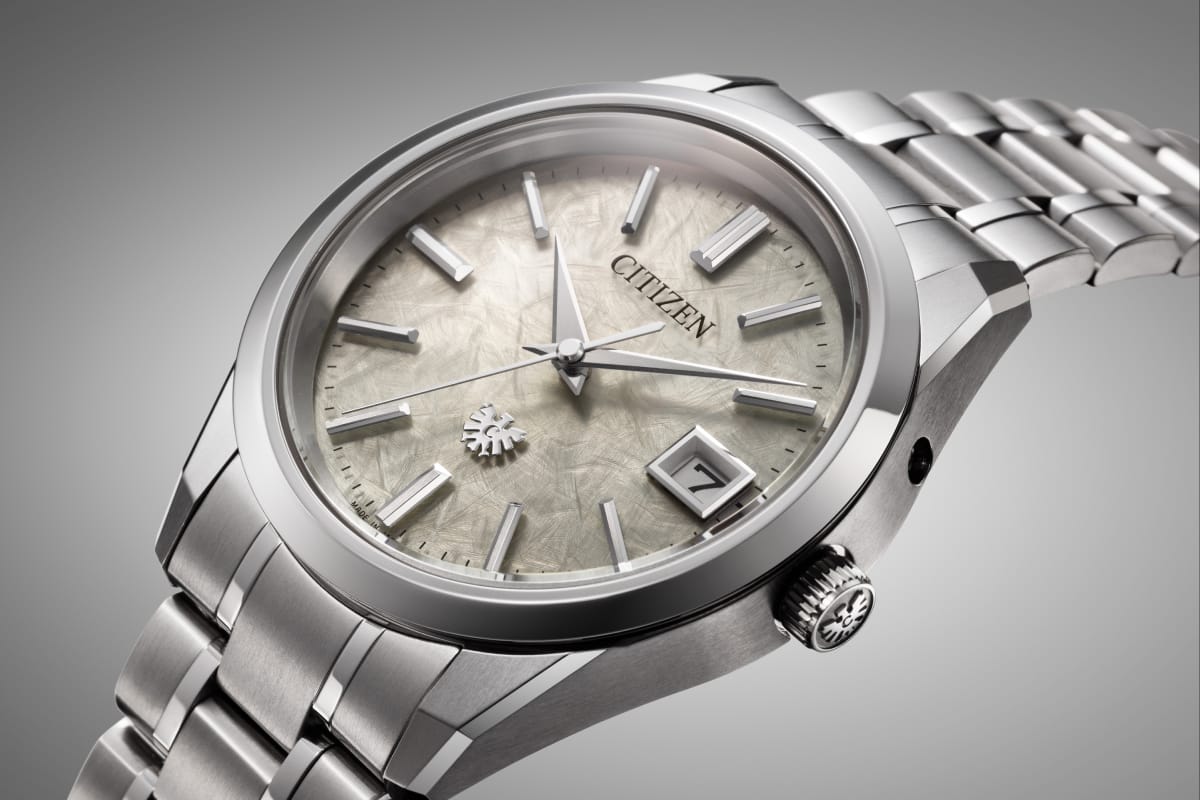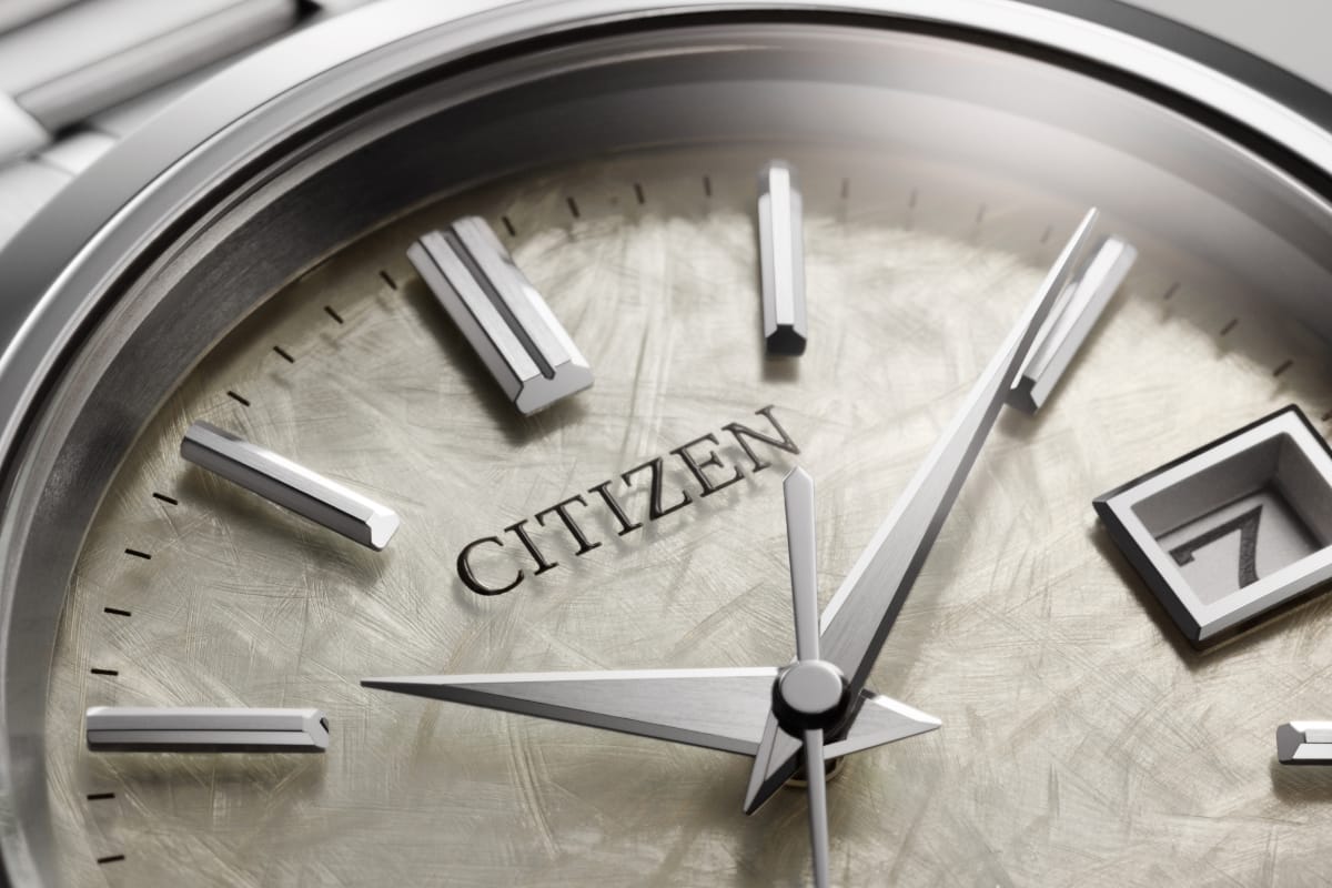 メカニカルモデルCaliber 0200は、これまでも高度な金属転写技術である「電気鋳造」手法を用いた独創的な文字板に挑んできました。今回はアイボリーカラーの文字板に、The CITIZENのシンボルである「イーグル」の羽を模したパターンを電鋳で施し、落ち着いた色味の中に躍動感のある仕上げを実現。さらに、直線的なインデックスや針と、曲線基調で有機的な模様を巧みに組み合わせることで、審美性と機能性が調和した印象的な文字板に仕上げています。