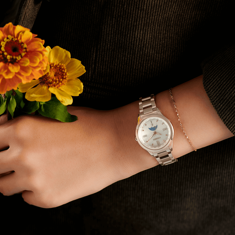 未来に続く、広く大きな大地がコンセプト。その大地を明るく照らす太陽と月のモチーフと、おおらかで洗練されたケース。凛とした佇まいが、大人な手元を演出します。