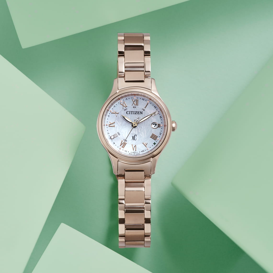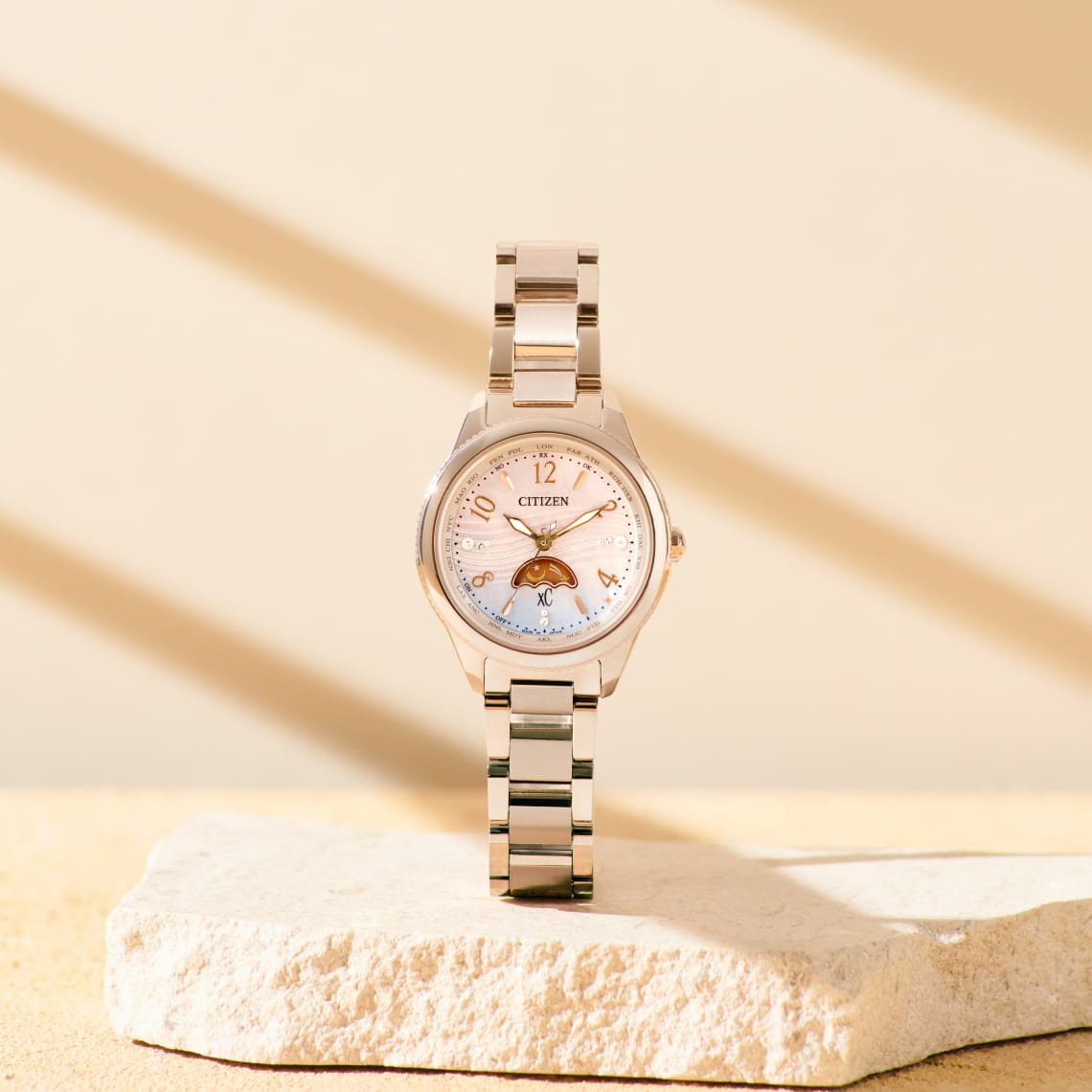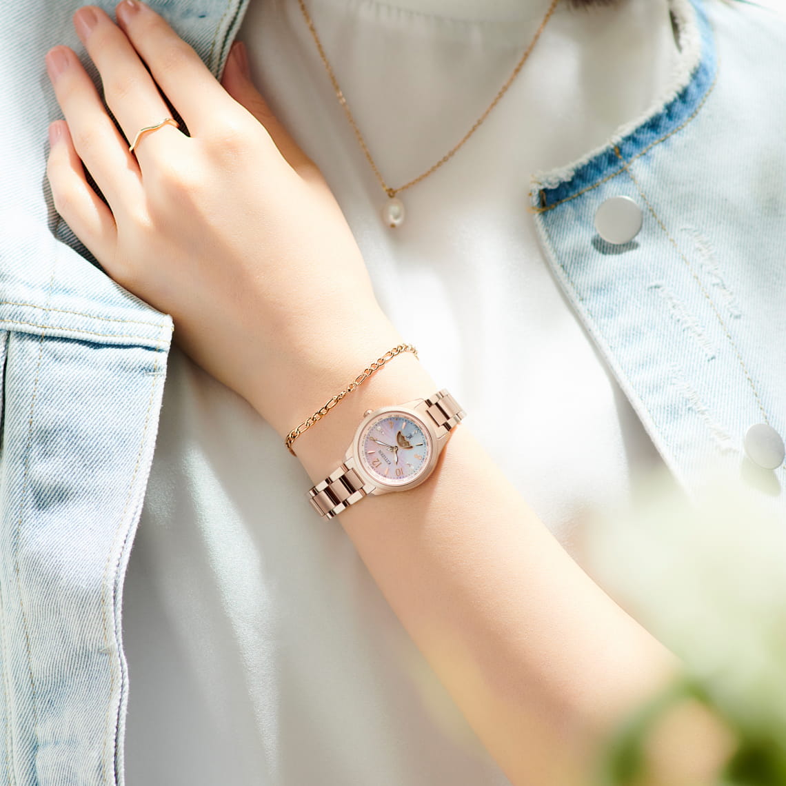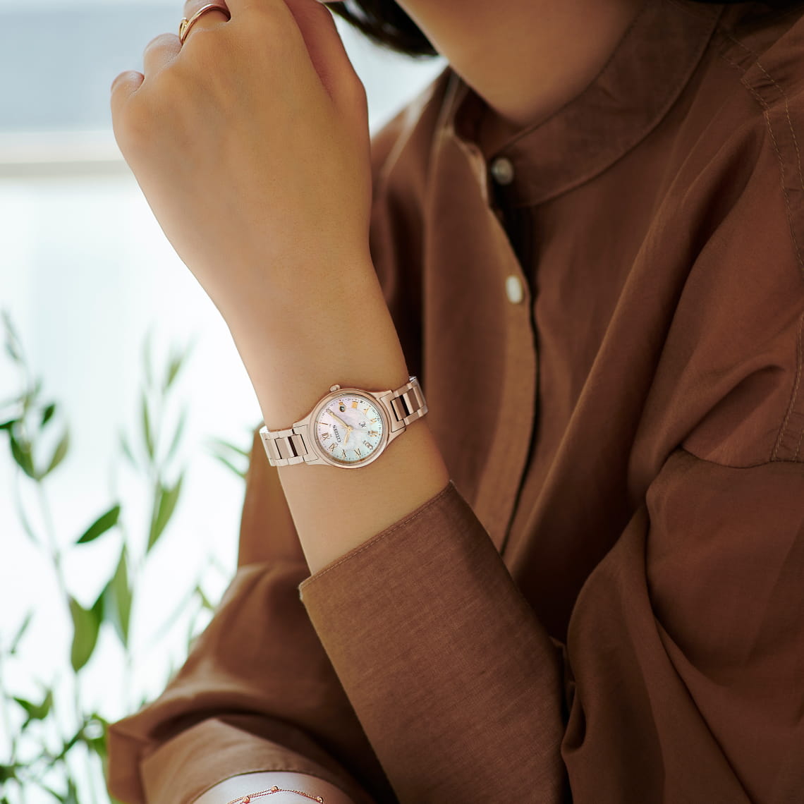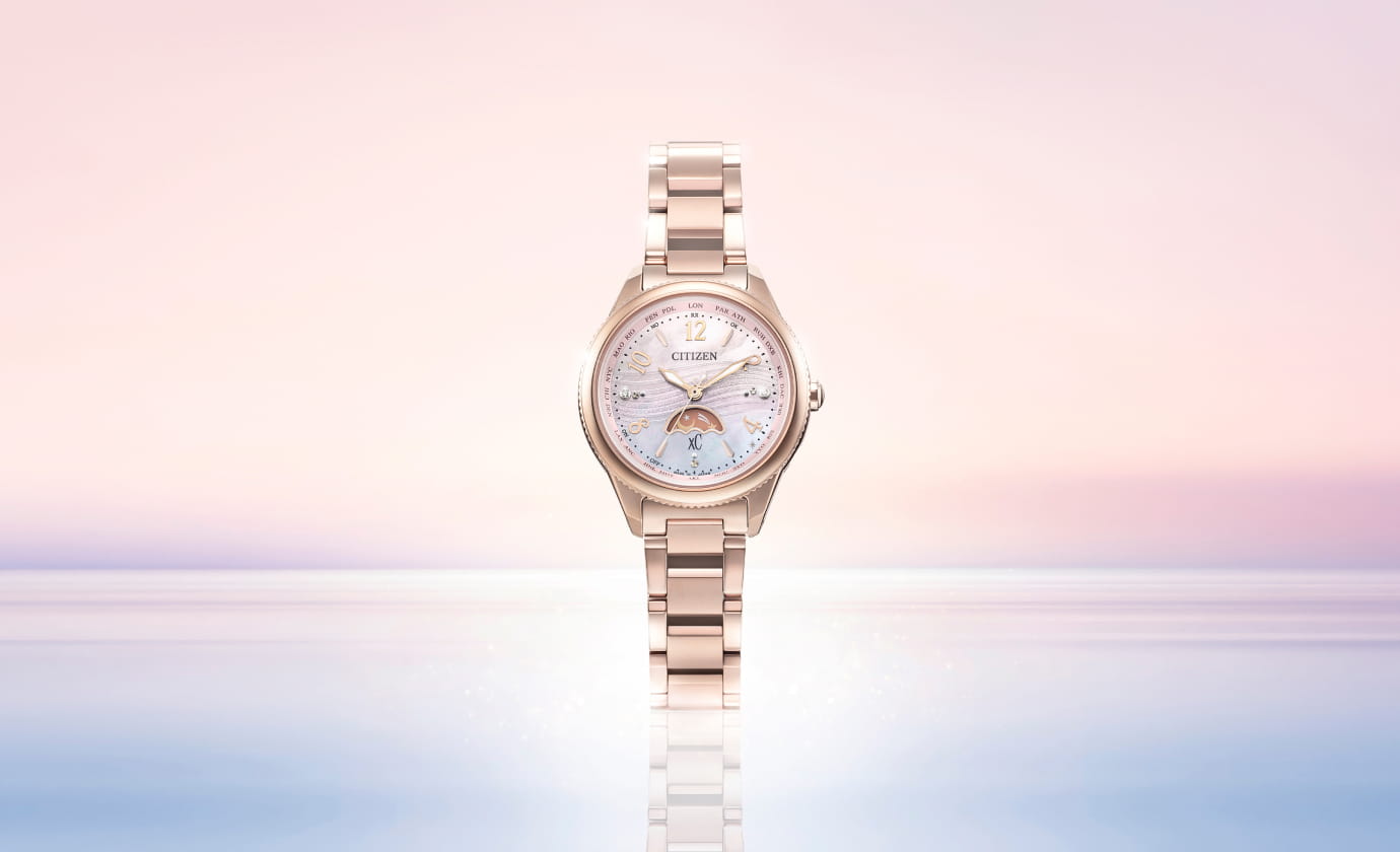 白蝶貝の文字板には、ピンクからブルーグレーに