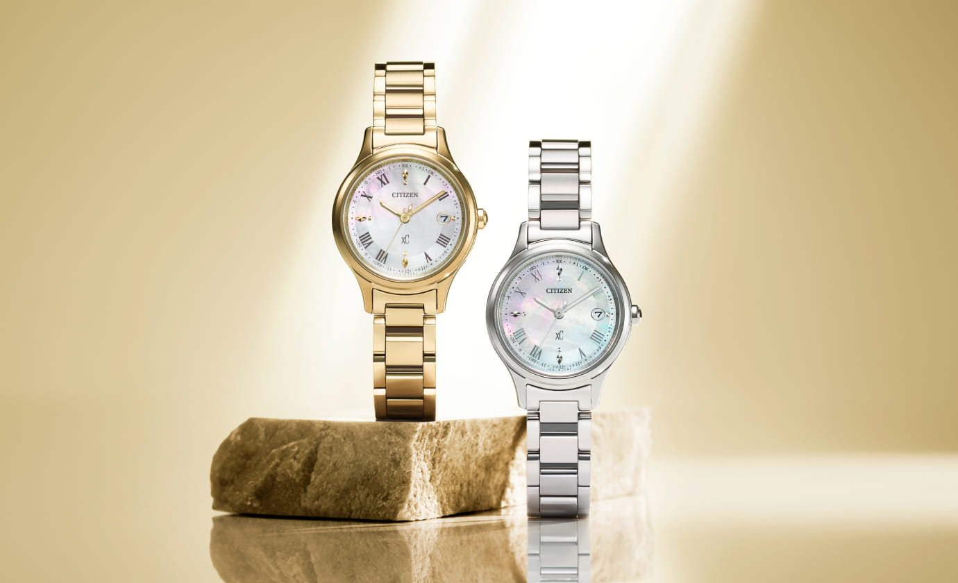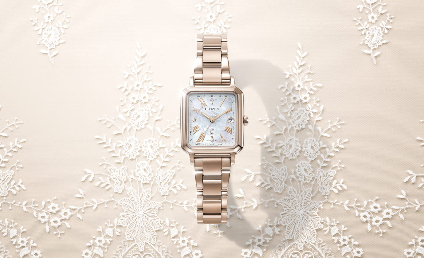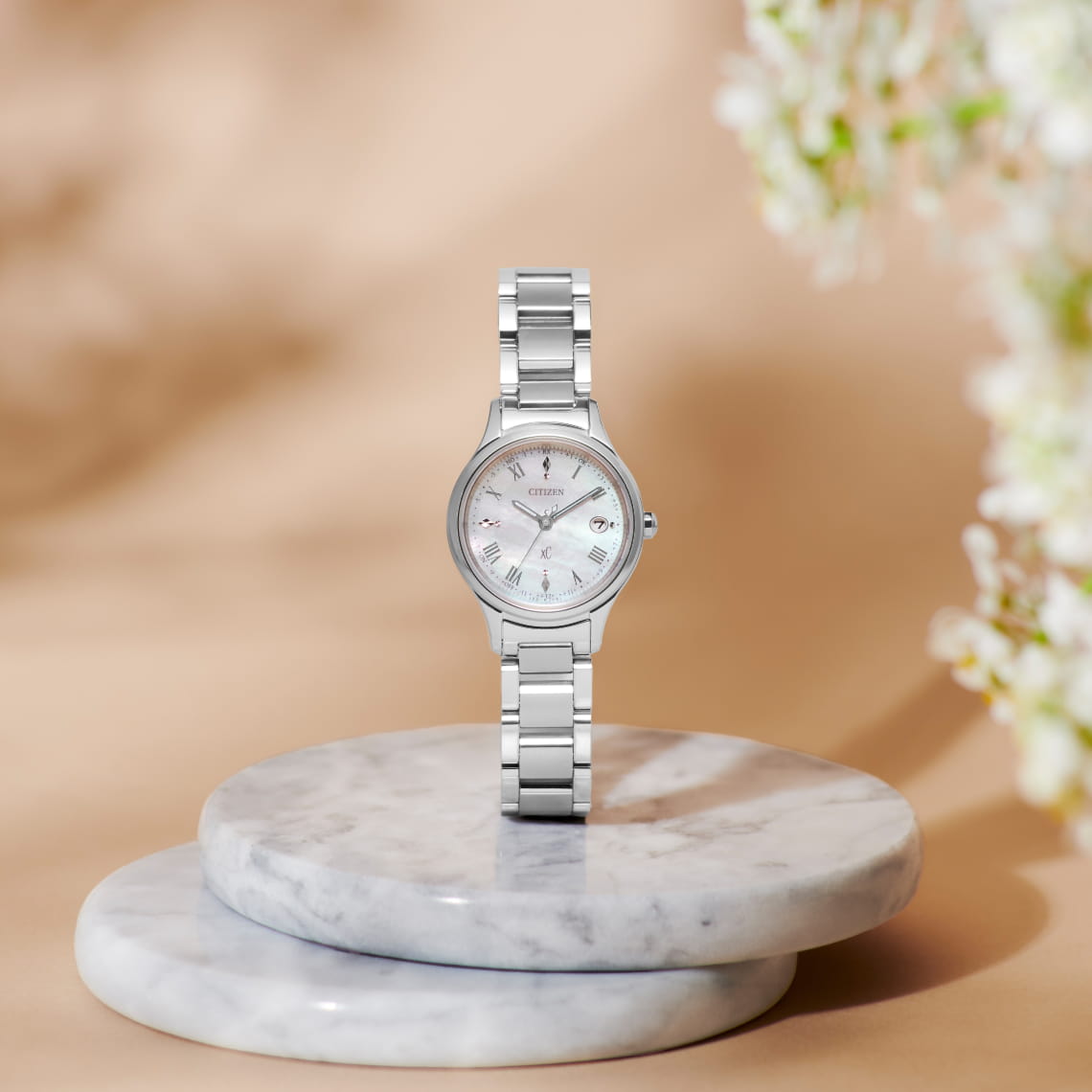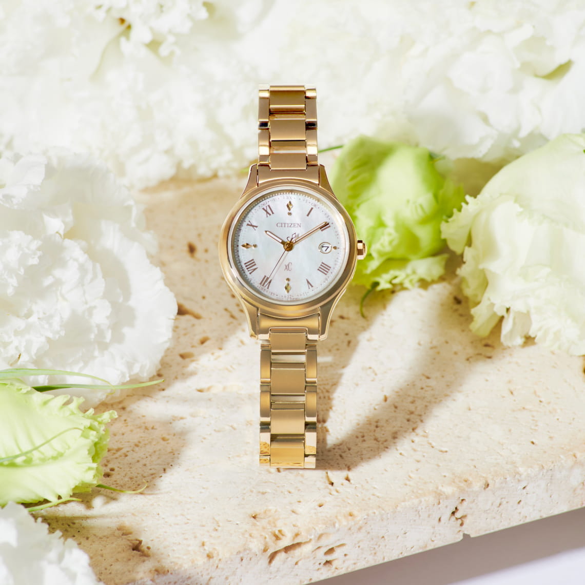 光沢ある白蝶貝の文字板に、“光の環”をイメージした